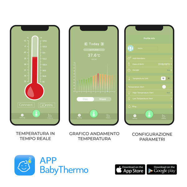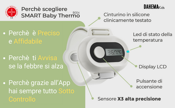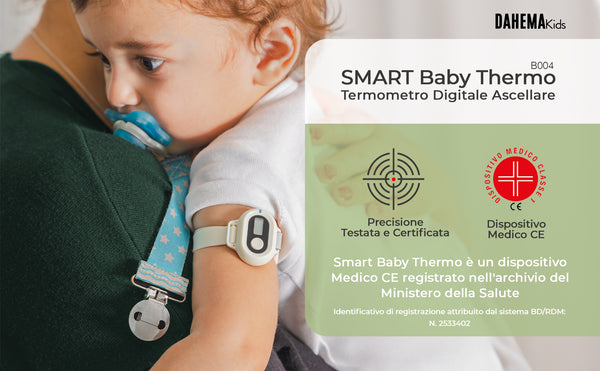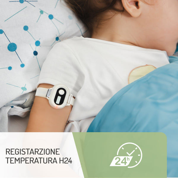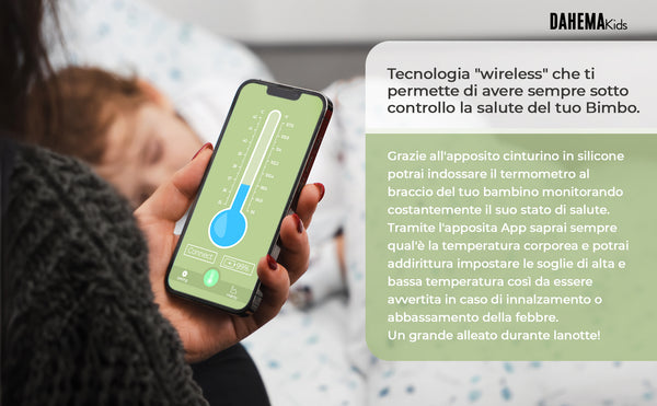 Baby Thermo è l'unico termometro bluetooth indossabile con app dedicata per la misurazione e monitoraggio della febbre. Grazie all'app potrai impostare la temperatura di allarme in modo da essere avviata se la febbre sale. Un vero e proprio alleato sopratutto durante la notte.